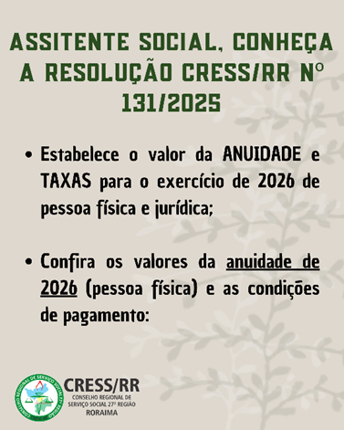 Para conhecer todas as regras acesse e leia a Resolução da anuidade 2026 (RESOLUÇÃO CRESS/RR N. 131/2025)